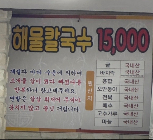단일 메뉴: 해물칼국수 (1인 15,000원)