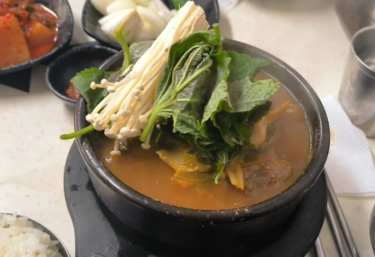 - 진하고 깊은 국물: 자극적인 조미료 맛보다는, 오랜 시간 우려낸 사골 육수의 깊고 구수한 맛이 일품입니다. 깻잎과 들깨가루가 듬뿍 들어가 향긋함과 고소함을 더해줍니다.