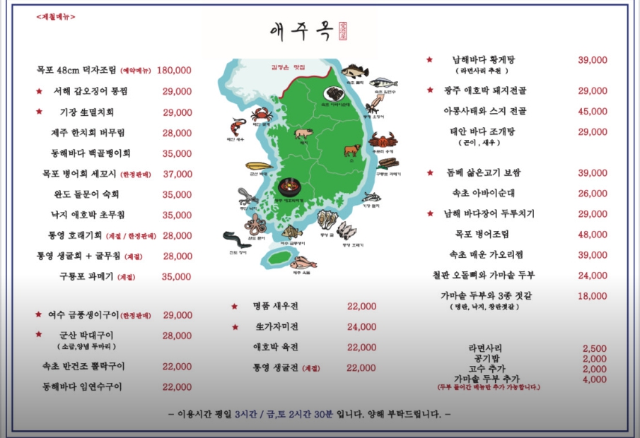 - 여수 금풍생이구이: 여수에서만 맛보던 귀한 생선구이까지 서울 한복판에서 즐길 수 있습니다.
