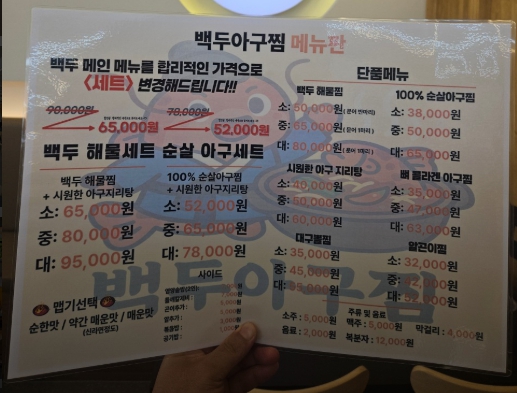 - 국물: 매콤한 찜 요리와 찰떡궁합! 맑고 시원한 국물의 아귀 지리탕은 속을 개운하게 풀어줍니다. 세트 메뉴로 시키면 가성비가 더 좋아요!