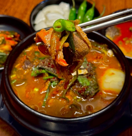 - 맛 포인트: 매콤하면서도 깊은 감칠맛이 폭발하는 국물! 푹 끓여내어 오리고기 특유의 질긴 맛 없이 야들야들한 식감이 예술입니다.