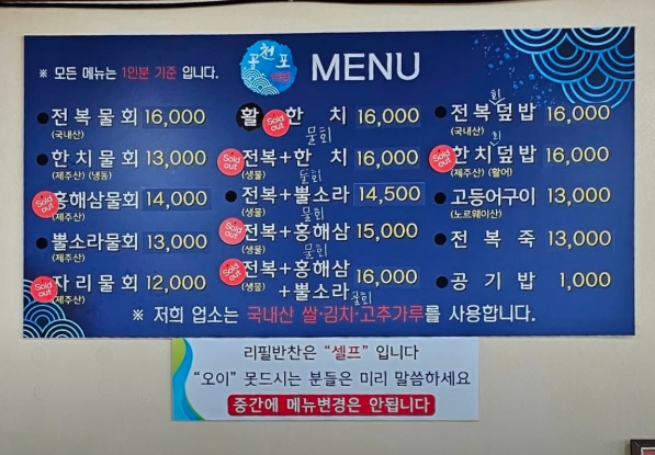 '공천포식당'의 메뉴판에서 가장 눈에 띄는 것은 바로 신선한 해산물을 활용한 물회입니다.