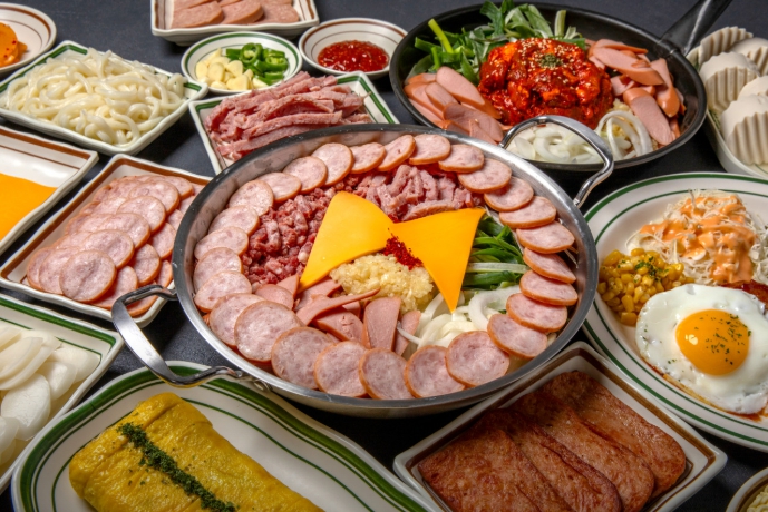- 메뉴 소개: 다양한 햄과 소시지, 베이컨, 민찌, 치즈, 그리고 직접 담근 김치와 대파, 마늘이 듬뿍 들어간 메인 메뉴입니다.